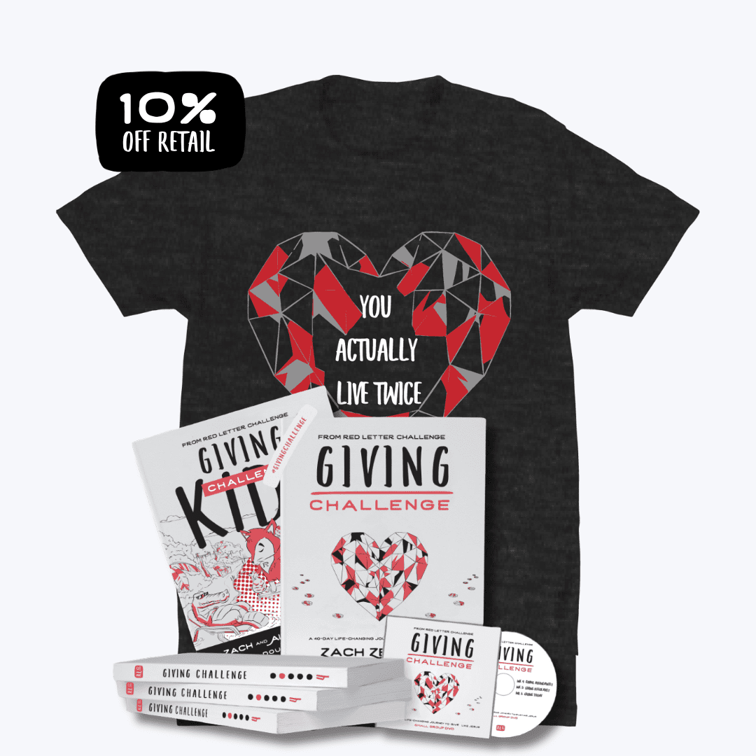 Enjoy 10% off Giving Challenge retail price when you purchase the GC Small Group/Staff Bible Study Pack instead of the individual retail items. This pack includes (10) books Giving Challenge or Giving Challenge Kids (you can mix and match), (1) Small Group DVD, (10) Wristbands, and (1) GC Shirt, plus bonuses for one low price!